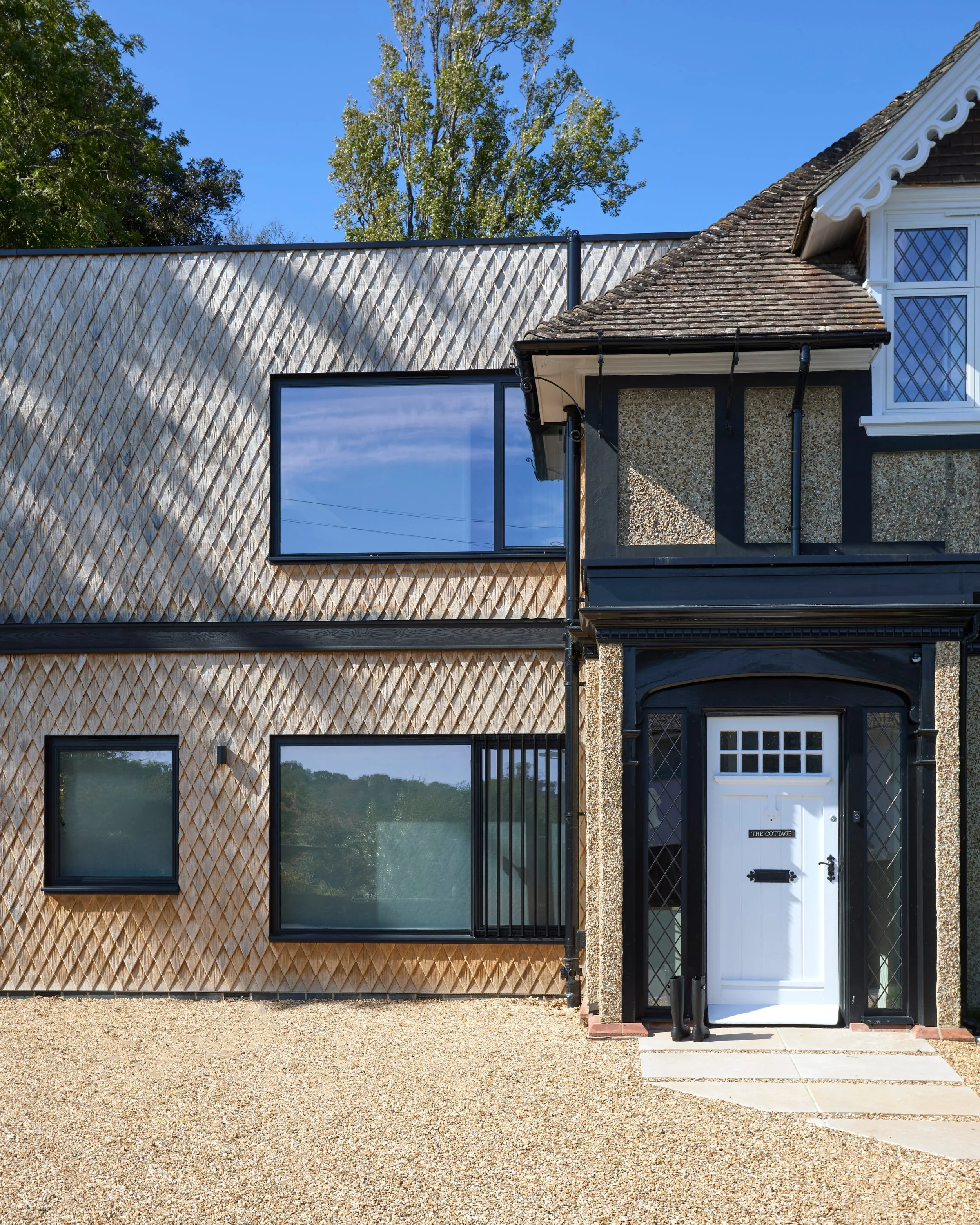 Diamond-shaped, lead-paned windows weave the old and new together, while bespoke oak shingles, cut into bevelled diamonds, offer a fresh interpretation of tradition. Set with fine, crisp black aluminium trims, these elements bring a contemporary elegance to the façade. The interplay of diamond shingles, blackened timber, and pebble dash allows the extension to both stand apart and belong, bridging the home's historic charm with the natural woodland at its rear and the urban rhythm of its frontage. A jewel has been set into its surroundings, enriching both home and streetscape.