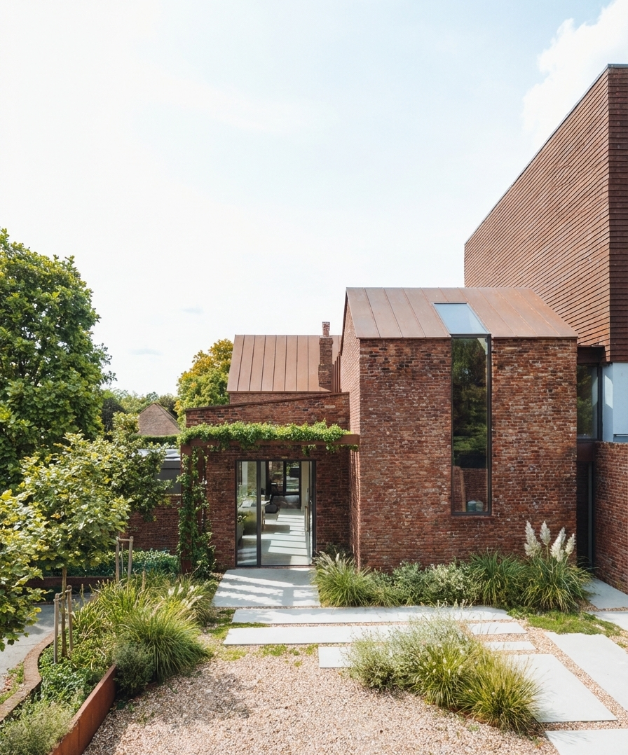 Designed to bridge the existing courtyard between the two outbuildings, the contemporary additions use glazing and Corten steel to create an open, airy working space that seamlessly blends into the buildings commercial, but historical setting, The rugged, tactile nature of traditional brickwork is set against the sharp, clean lines of the Corten,