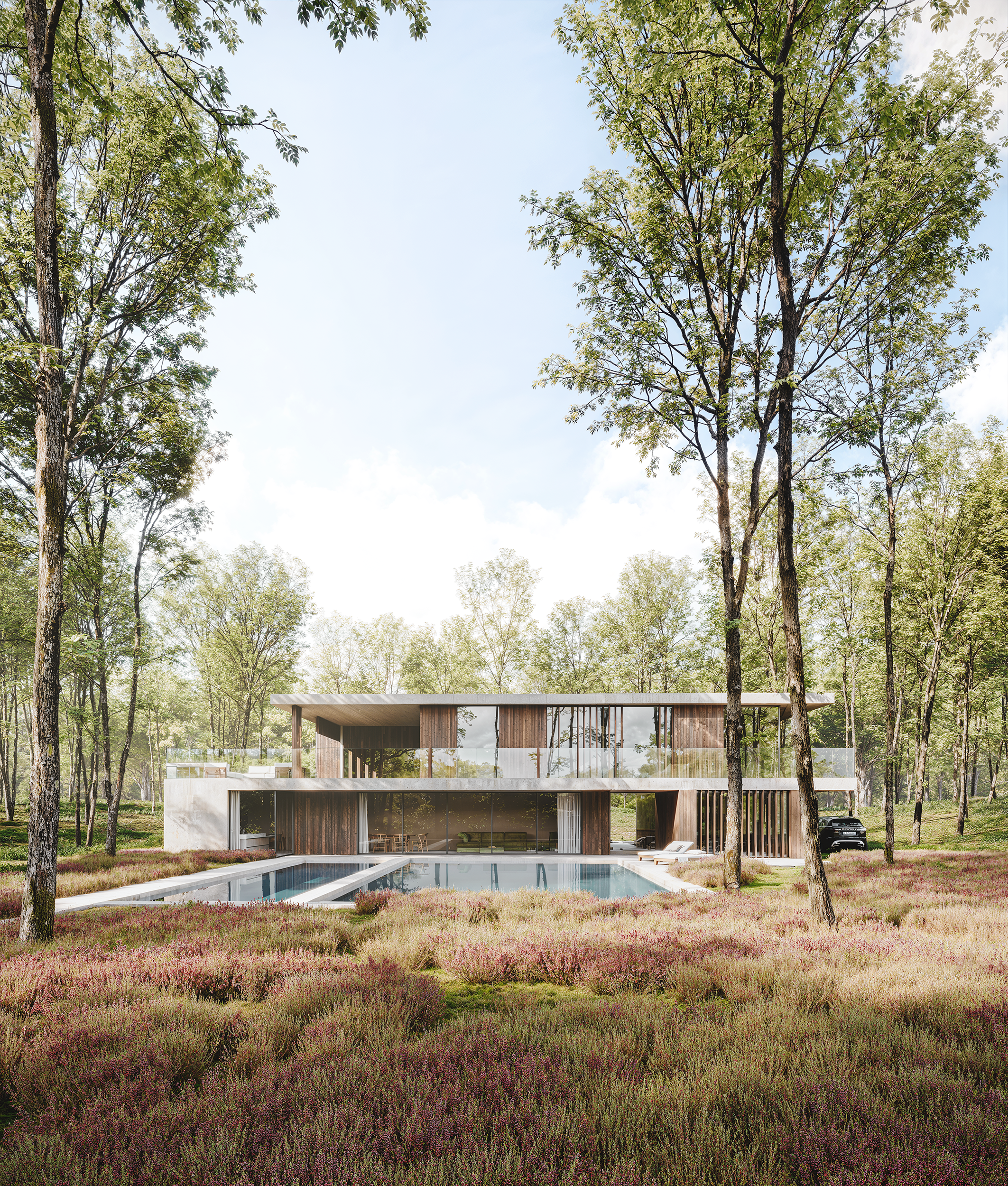 Perched on the outer edges of the New Forest National Park, where dense heather sprawls across the ground, bracken evokes a prehistoric atmosphere, and gorse tears at the skin, we have positioned a new-build house at the crest of a rise.