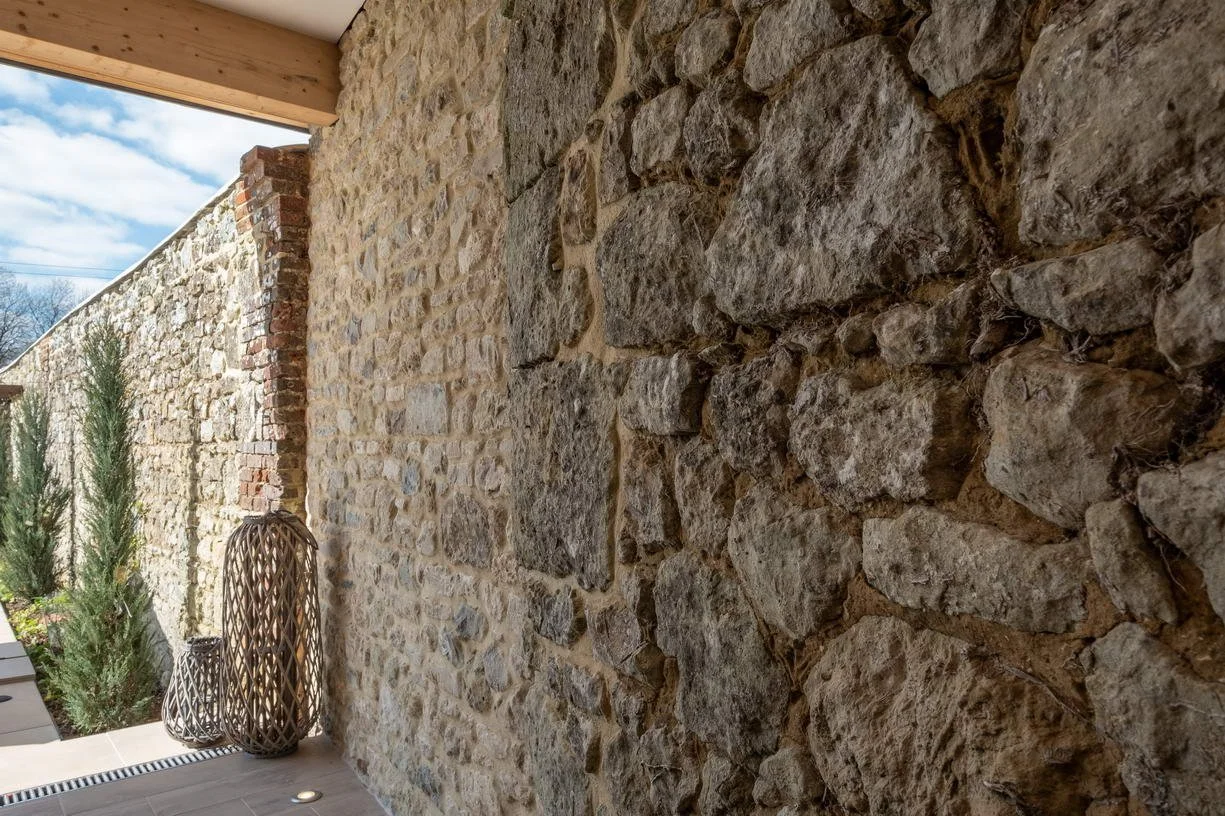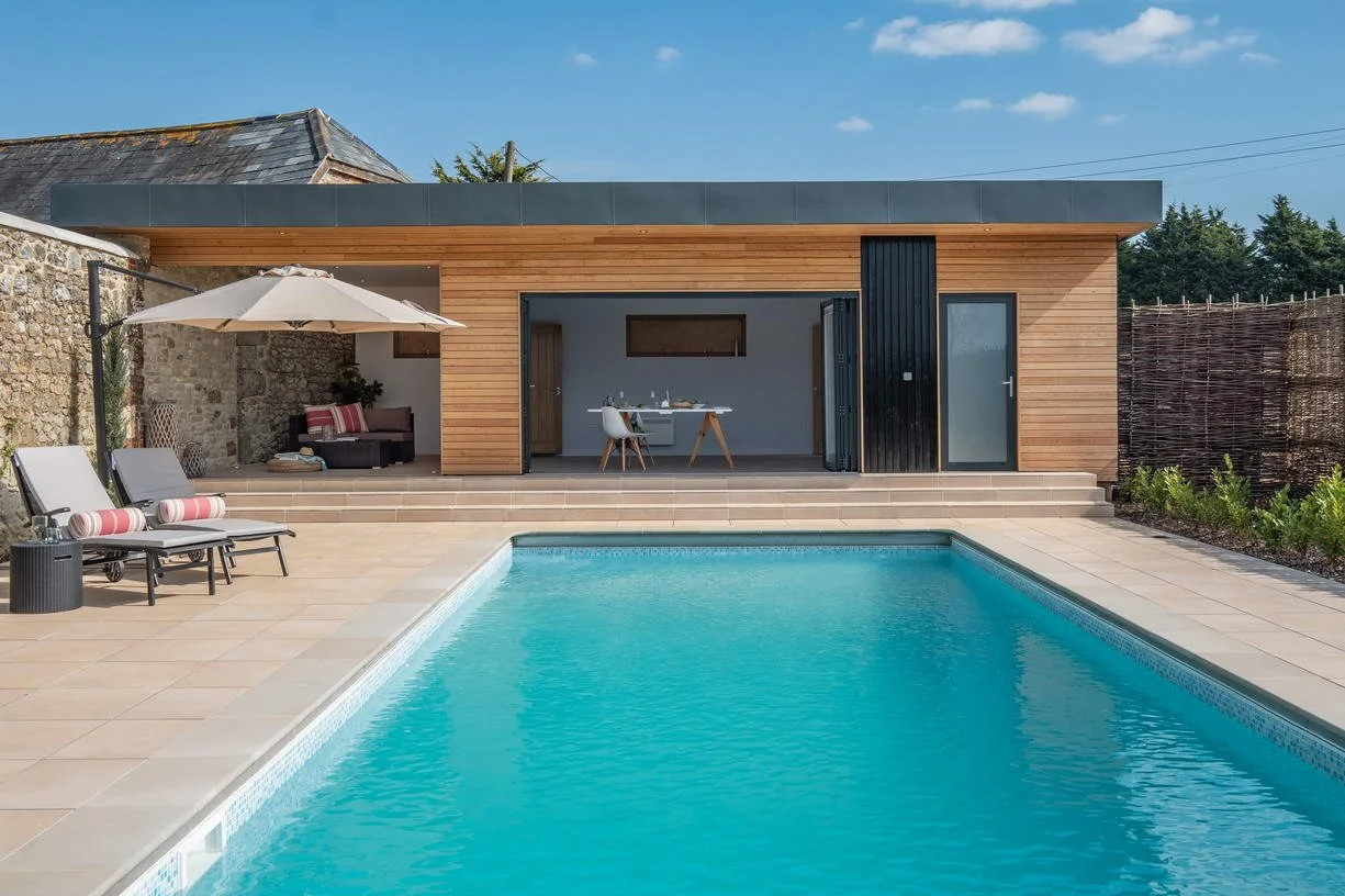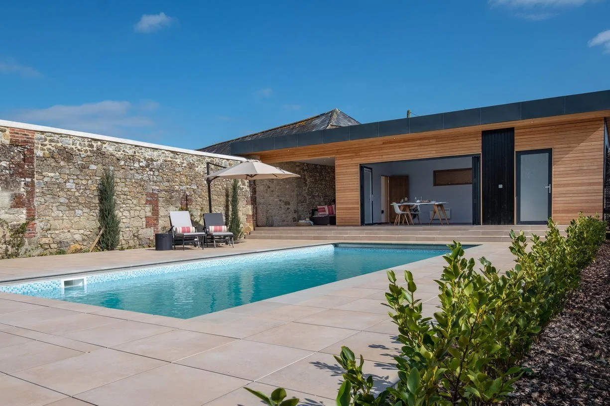 This new pool house is a study in contrasts, designed to sit harmoniously alongside the existing timber stable block and a historic 1736 stone wall, yet distinctly contemporary in its own right. It needed to integrate with its surroundings while asserting its modern identity.